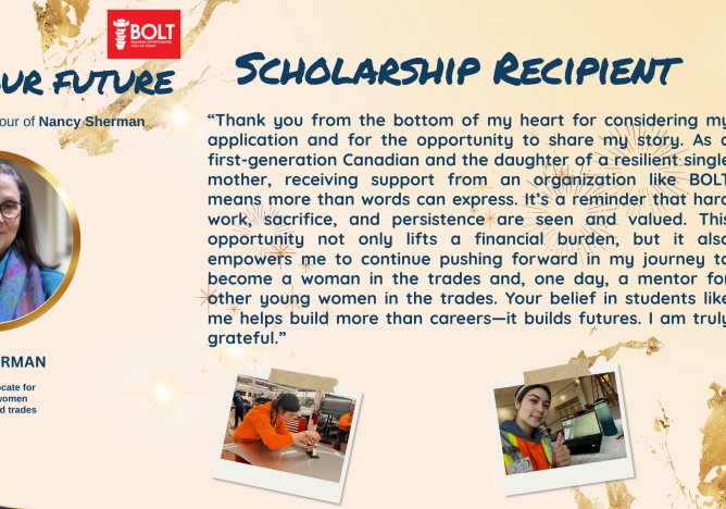 “It is especially meaningful to me just knowing the BOLT Women in Construction Scholarship is even available. It reminds me that there IS support, and there are people who believe in us as tradeswomen. As I near the end of my apprenticeship this scholarship is going to be a great financial help to me. I am currently laid off for my last block of in class training, and I am now able to take a few extra days off at the end to study for my red seal exam and prepare to become a Journeyperson. Thank you BOLT, Tridel & Support Ontario Youth (SOY) for selecting me as a recipient of this amazing scholarship and the continued support you bring to women in the trades.”